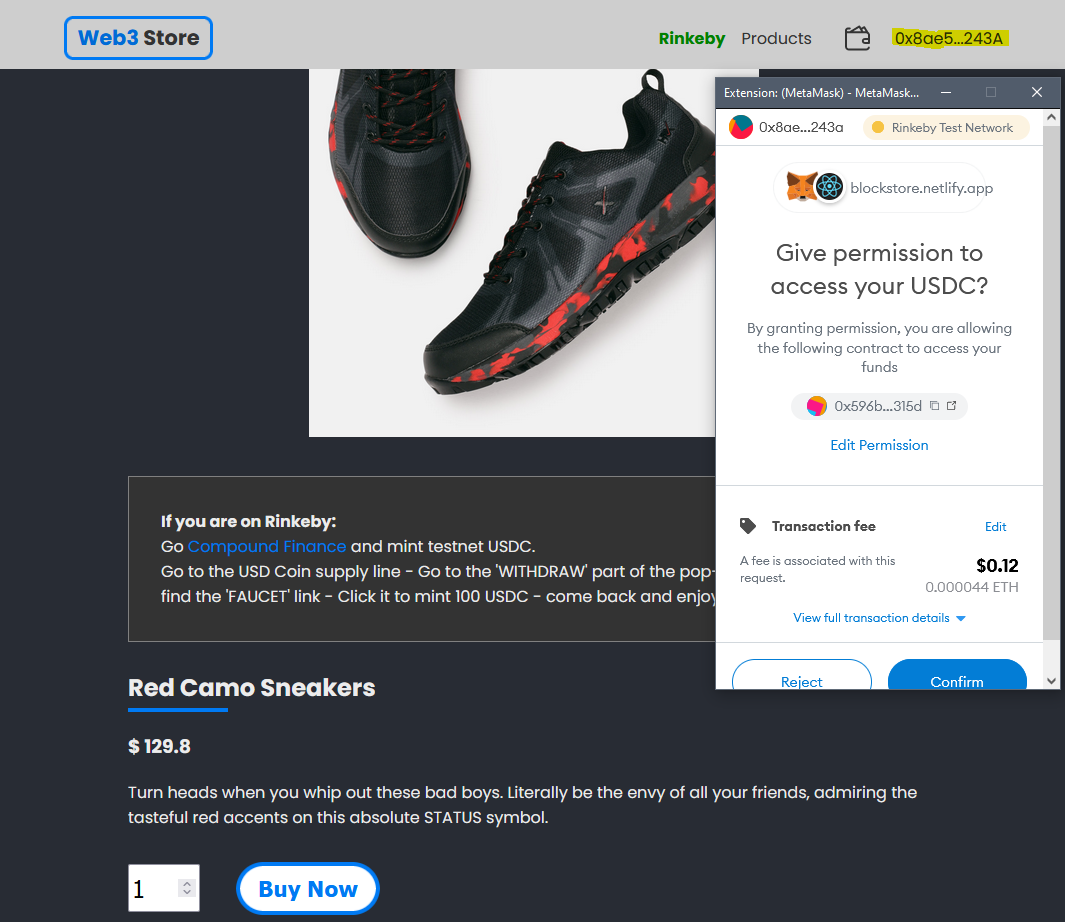 2. Browse the site and products, to make a purchase, follow the instructions on the product page to get testnet USDC