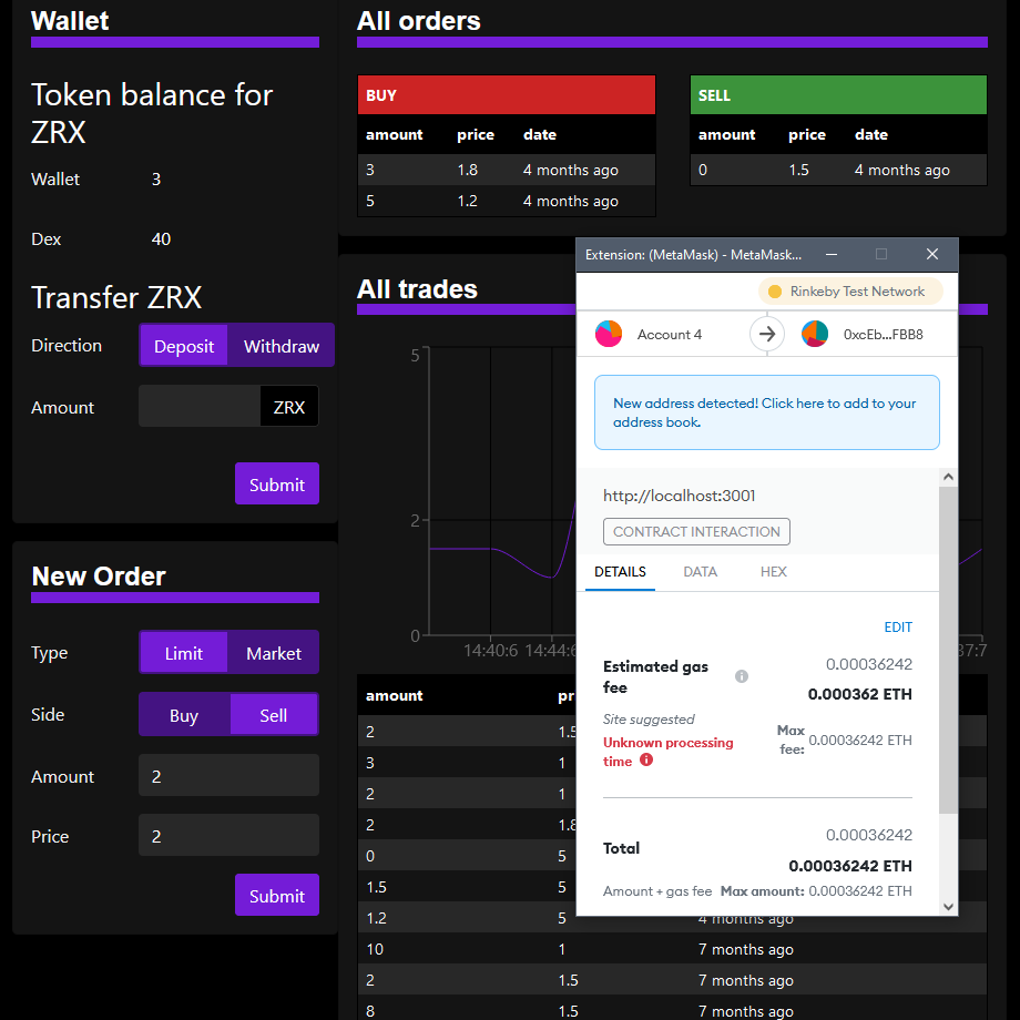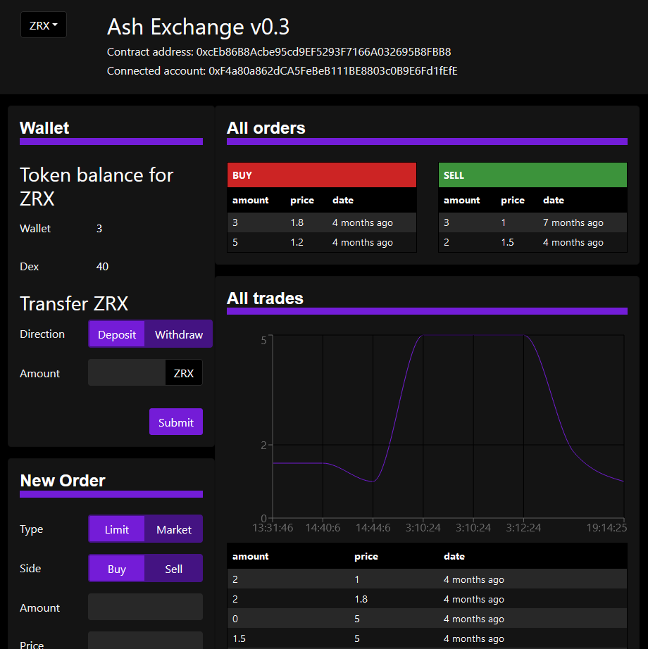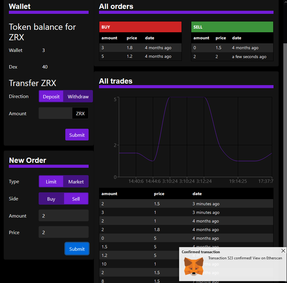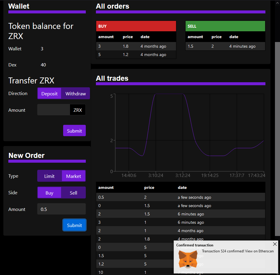 Graphs and order UI update live as new trades are made