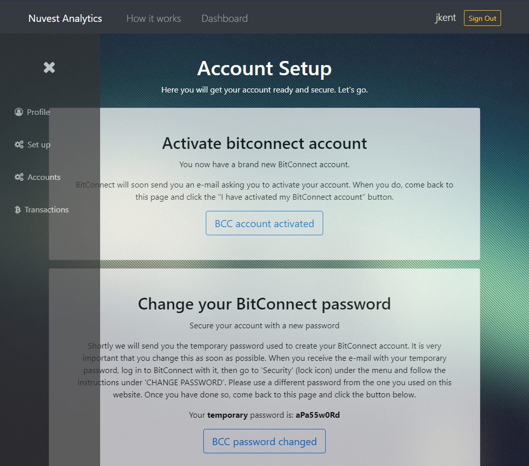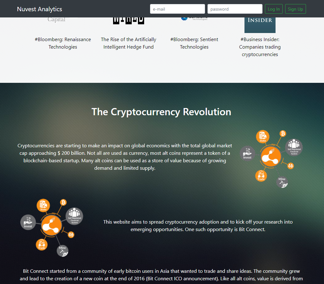 Before it was uncovered to be a scam project, bitconnect was a top 15 crypto coin by market cap. I was one of its users earning ~0.8% per day off their "AI trading bot". During Oct & Nov '17 I decided to build a site to help users navigate setting up and getting started with it. (NOTE: the site never had any actual users)